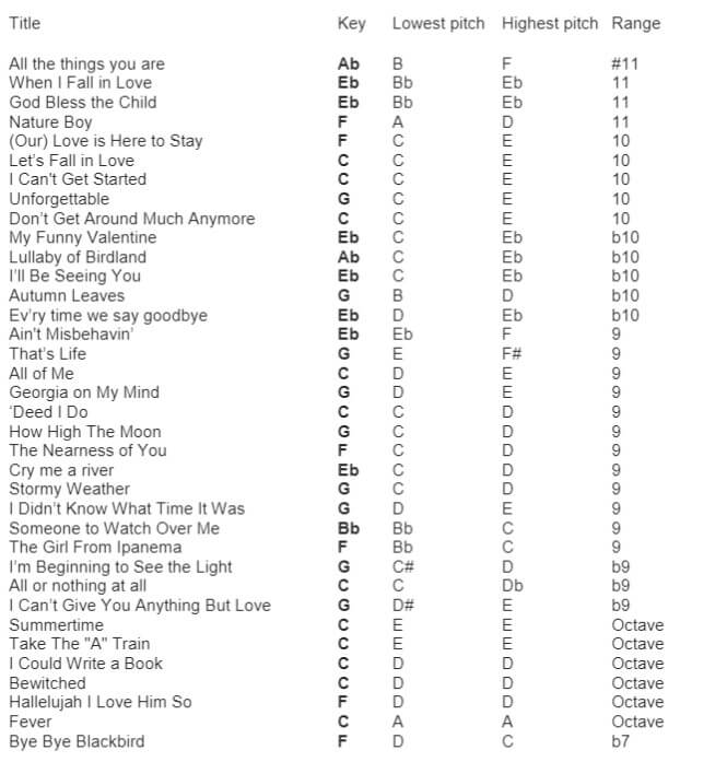 If you’re a beginner looking to start singing jazz, here are a few quick tips for you, followed by a list of songs with their ranges.
